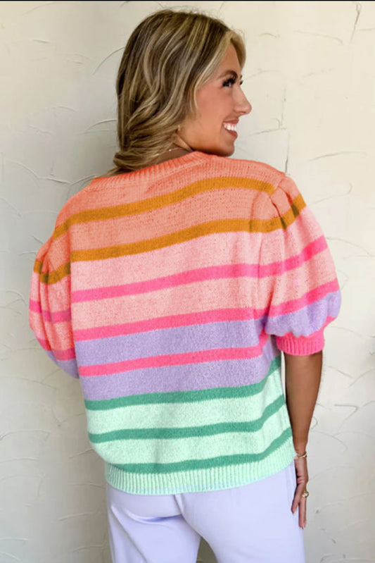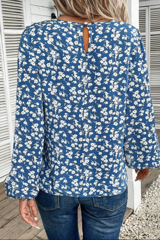 Blue Ditsy Floral Print Top with Lantern Sleeves