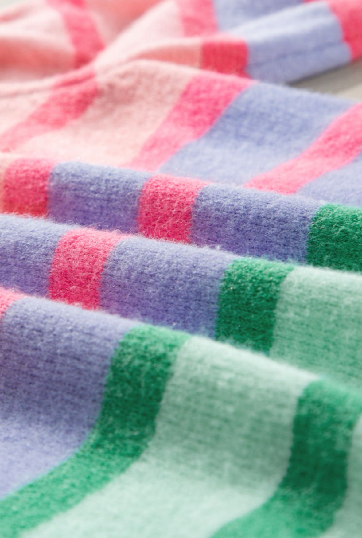 This fashionable sweater top features a vibrant, eye-catching striped pattern that adds a touch of classic charm. It also boasts trendy bubble short sleeves for a stylish and versatile look that is suitable for different occasions. It can be layered or worn on its own, making it a versatile piece for any wardrobe.