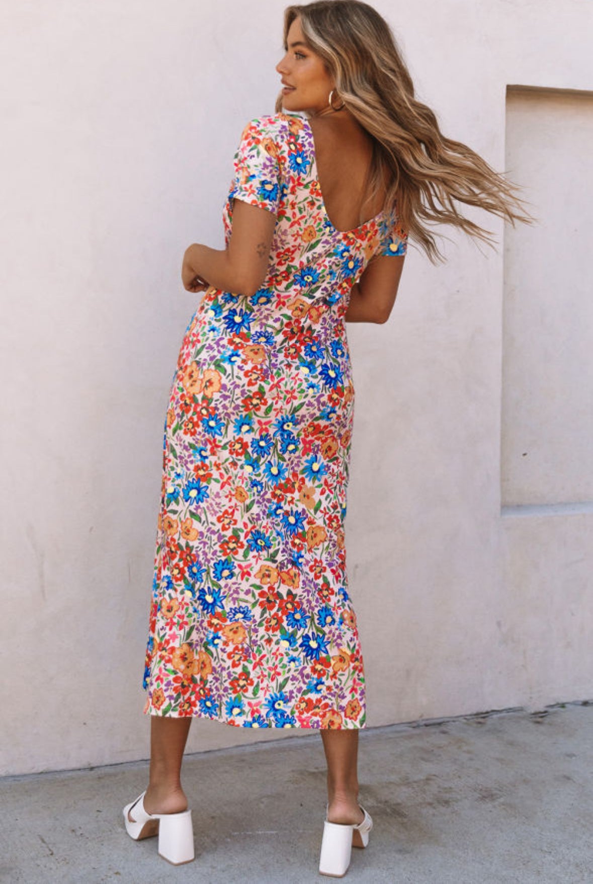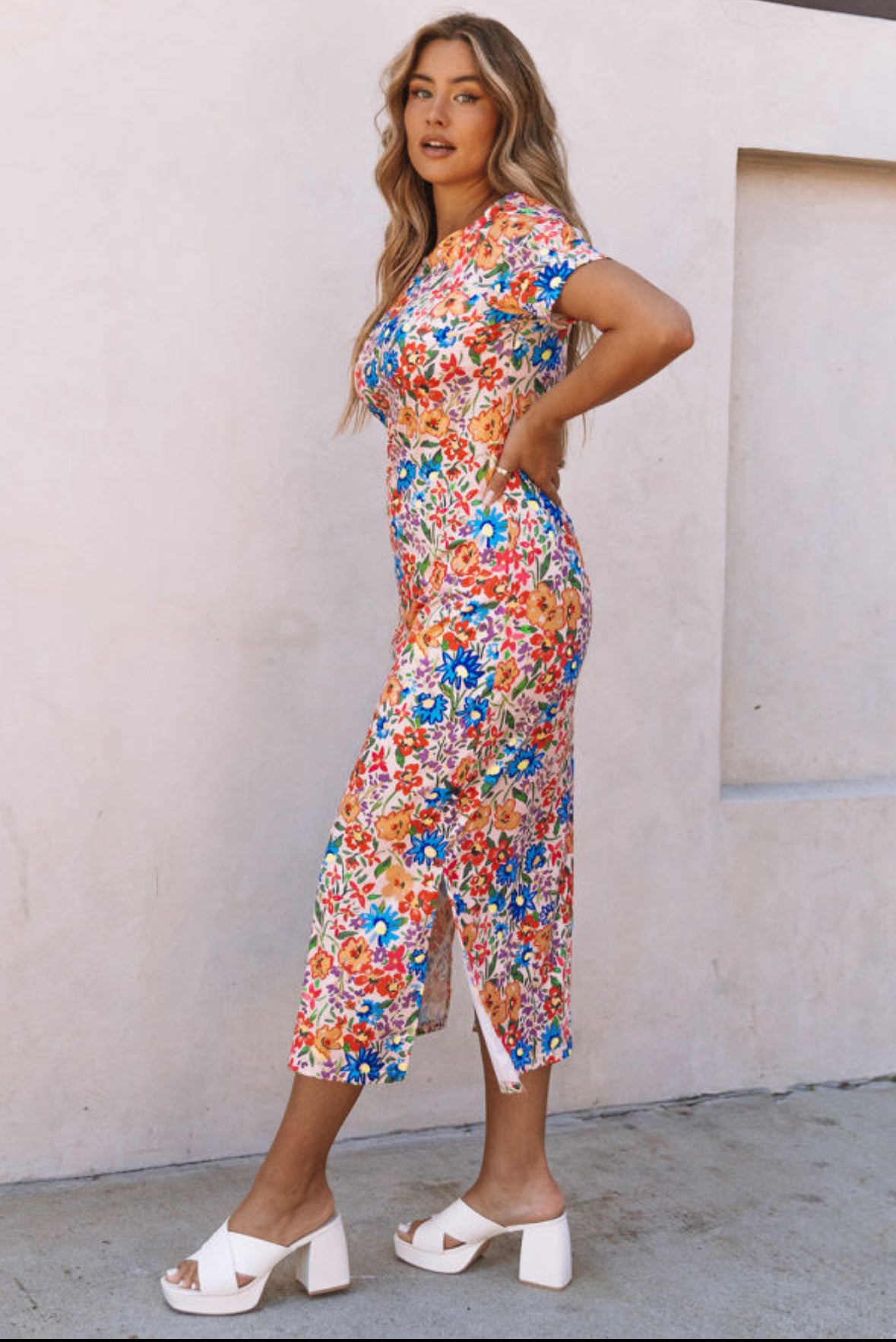 - This beautifully designed long dress features a casual fit and a vibrant floral print. The crisp cut, round neck, and subtle side slit offer a chic and fashionable look. Designed with short sleeves and an ankle length cut, this dress is perfect for staying cool on hot days.